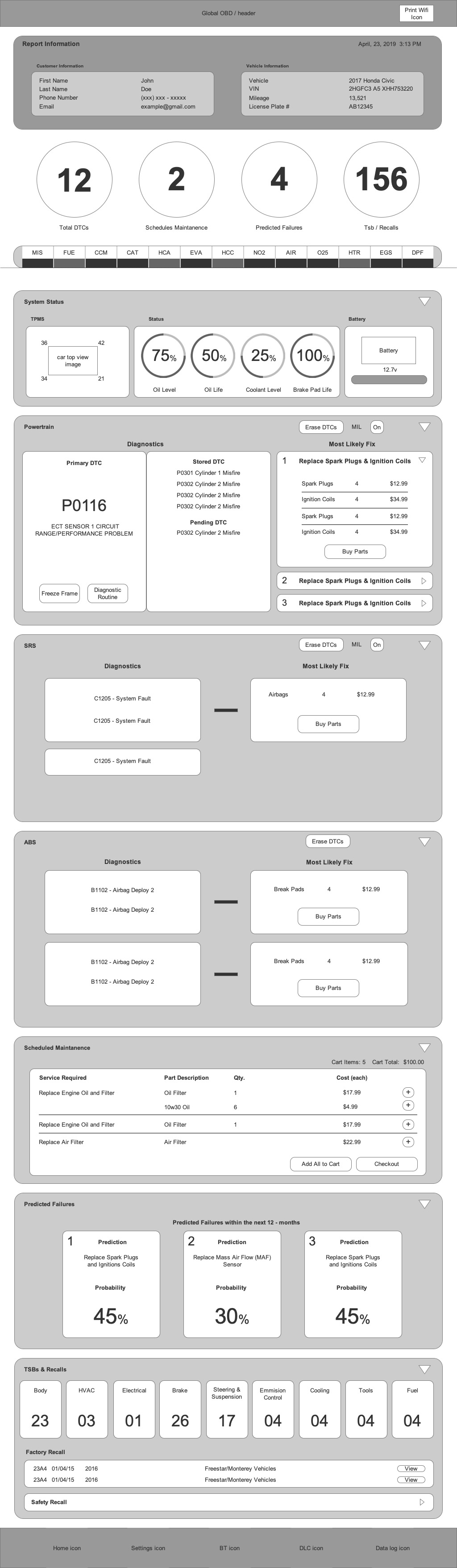 Don’t overwhelm the user with too much information. Having the 4 circles break down the Total DTCs, scheduled maintenance, predicted failures, and Recalls. Helps keep the most important information summaries above the fold.